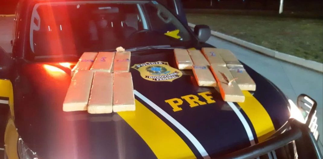 Na vistoria do automóvel, os policiais rodoviários federais localizaram o carregamento de droga no porta-malas do veículo. Um casal foi preso em flagrante.