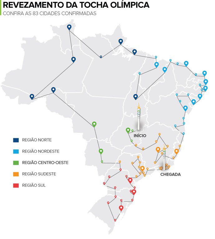 A chama passará por Erechim, Passo Fundo, Cruz Alta, Ijuí, Santo Ângelo, Encantado, Lajeado, Santa Cruz do Sul, Santa Maria, São Sepé, Caçapava do Sul, Canguçu, Rio Grande, Pelotas, São Lourenço do Sul, Camaquã, Guaíba, Porto Alegre, Canoas (a confirmar), Esteio (a confirmar), Novo Hamburgo, Nova Petrópolis, Canela, Gramado, Caxias, Bento Gonçalves e Torres, no Litoral Norte Gaúcho.