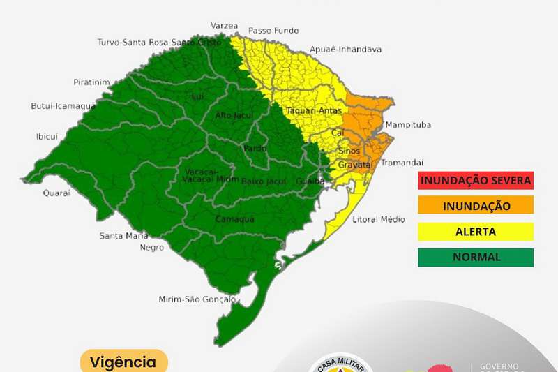 As bacias afetadas incluem Apuaê-Inhandava, Passo Fundo, Várzea, Alto Jacuí, Taquari-Antas, Caí, Sinos, Gravataí, Litoral Médio, Tramandaí e Mampituba.