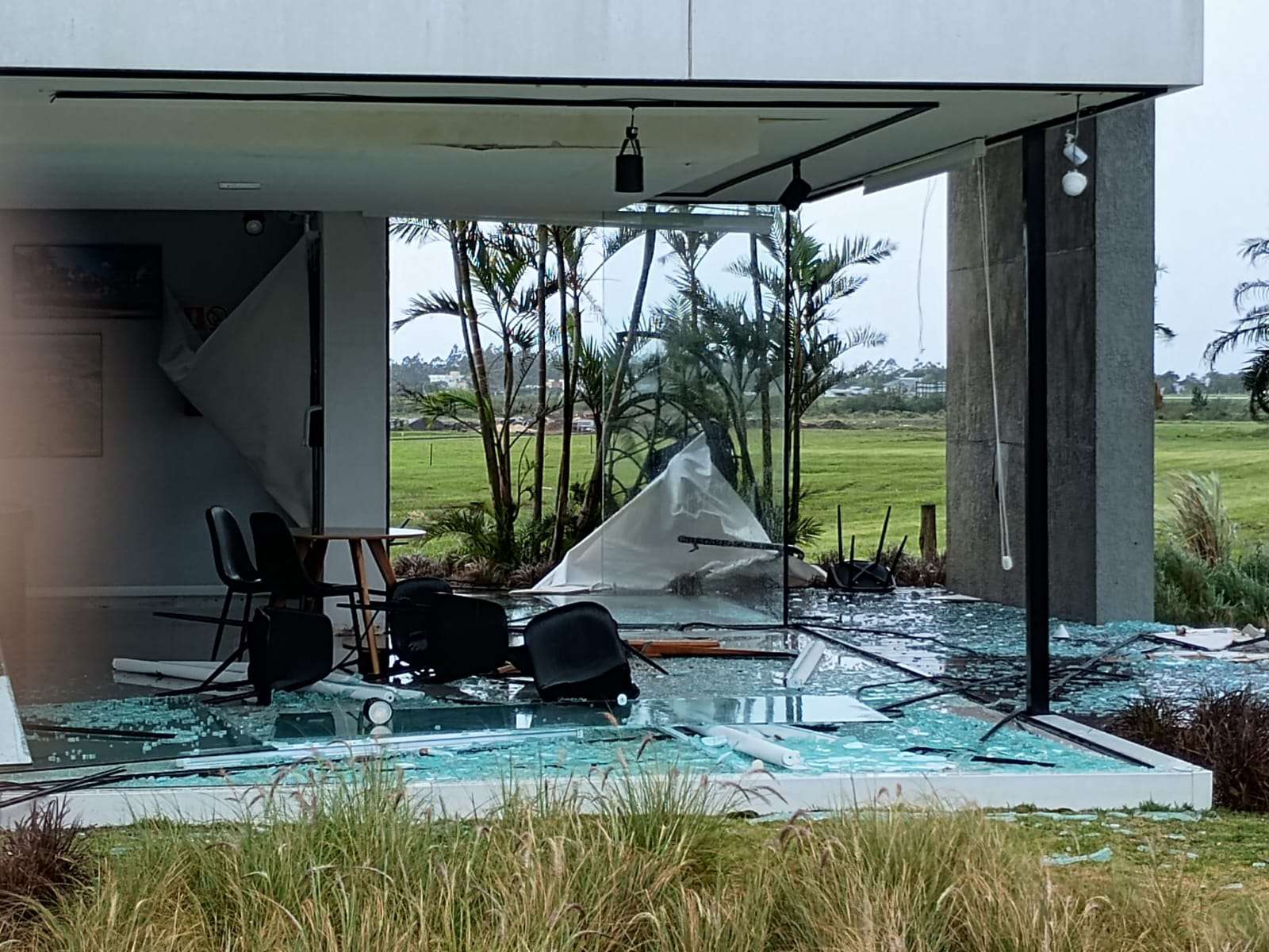 A Central de Vendas do Brisas, bairro planejado da cidade, ficou completamente destruída.