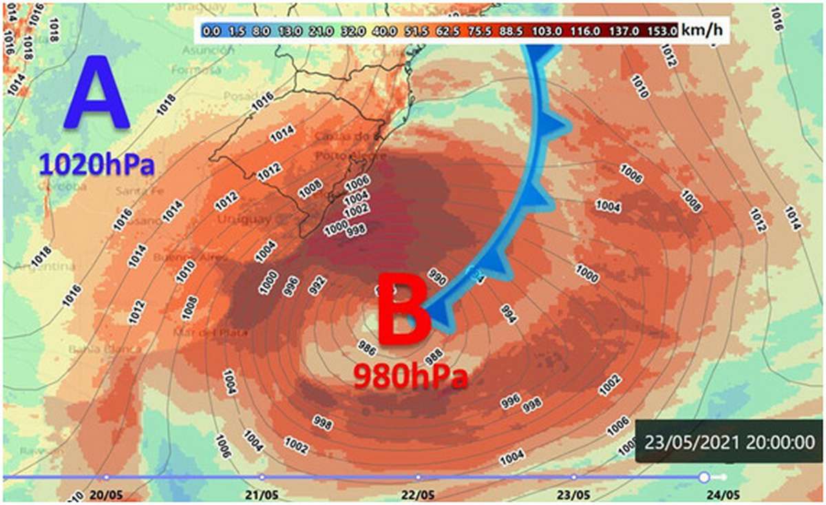 A Marinha do Brasil, por meio do Centro de Hidrografia da Marinha (CHM), participa que a formação e a aproximação de um sistema frontal poderão provocar ventos de direção Nordeste a Noroeste, com intensidade de até 75 km/h (40 nós), na faixa litorânea dos estados do Rio Grande do Sul e de Santa Catarina, ao sul de Garopaba, entre as noites dos dias 21 e 22 de maio.