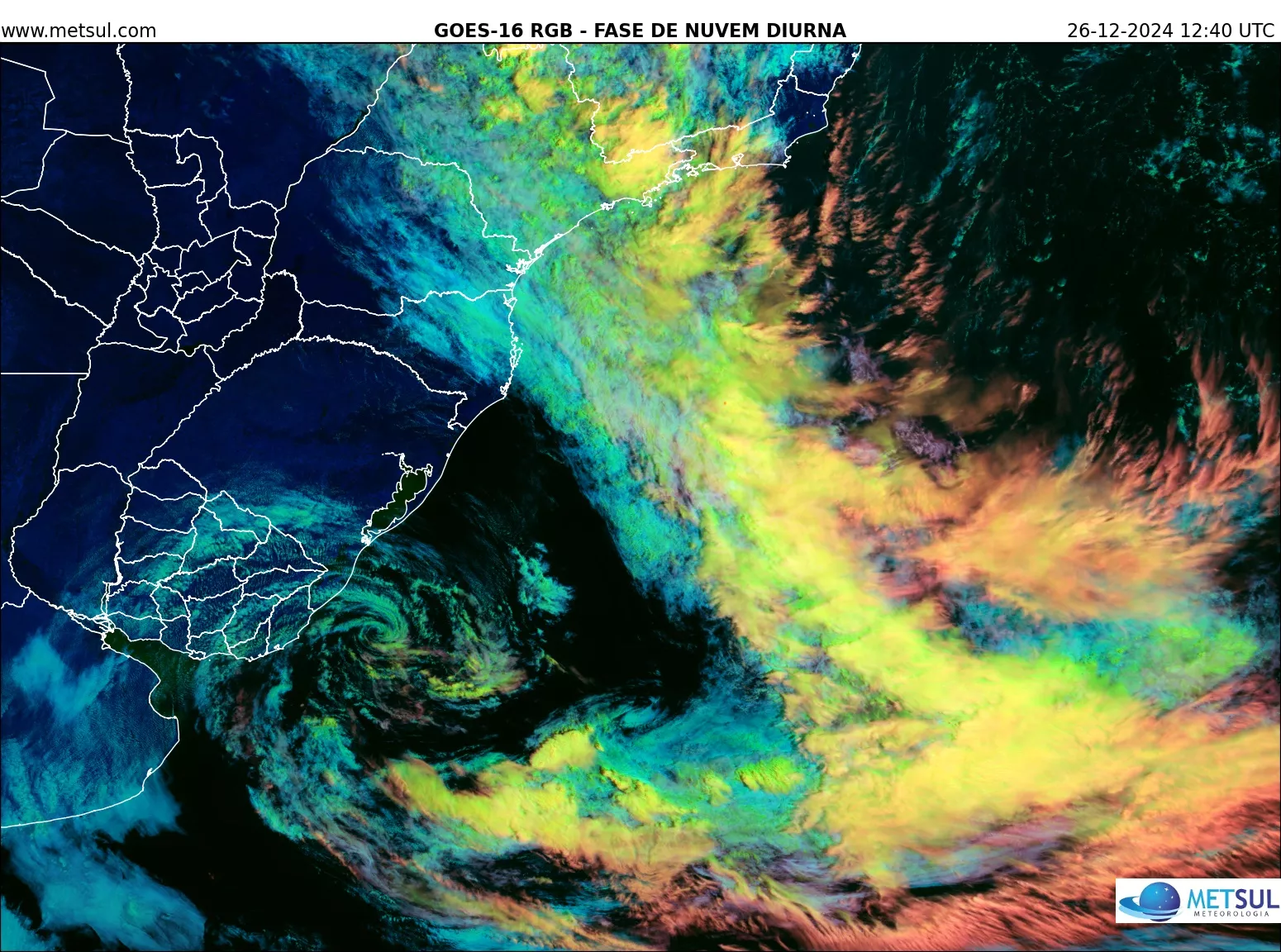 A formação de um ciclone extratropical nesta quinta-feira (26) chamou a atenção pela sua localização e timing incomuns. Imagens de satélite revelaram o sistema com o centro do vórtice na costa do departamento de Rocha, no Uruguai, e do Litoral Sul do Rio Grande do Sul.