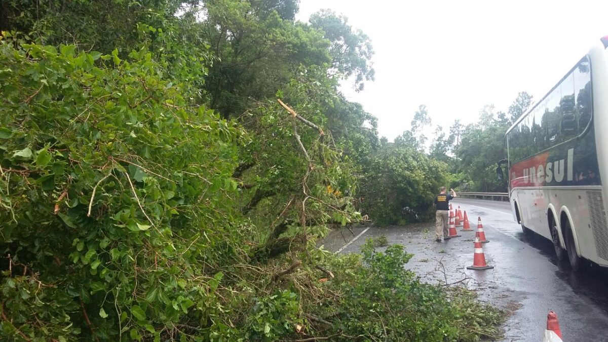 Na BR-101, árvores caíram sobre a pista, interditando parcialmente a rodovia na região. O trânsito já foi normalizado.