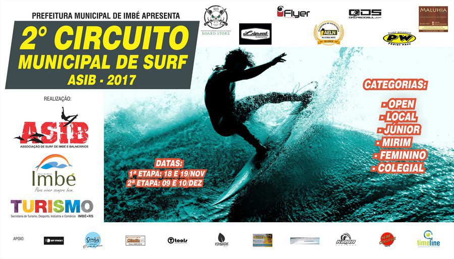 A Associação de Surf de Imbé e Balneários (ASIB) realiza neste final de semana (dias 18 e 19 de novembro) a 1ª etapa do Circuito Municipal de Surf 2017. O evento, que acontece na Guarita Central, no Calçadão, é apresentado pela Prefeitura Municipal de Imbé e distribuirá R$ 10 mil em prêmios para seis categorias: Open, Local, Júnior, Mirim, Feminino e Colegial.