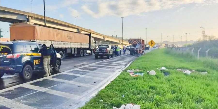 De acordo com a PRF, um caminhão Mercedes-Benz, com placas de Charqueadas, colidiu na traseira de um outro caminhão Volkswagen, com placas de Colombo, no Paraná.