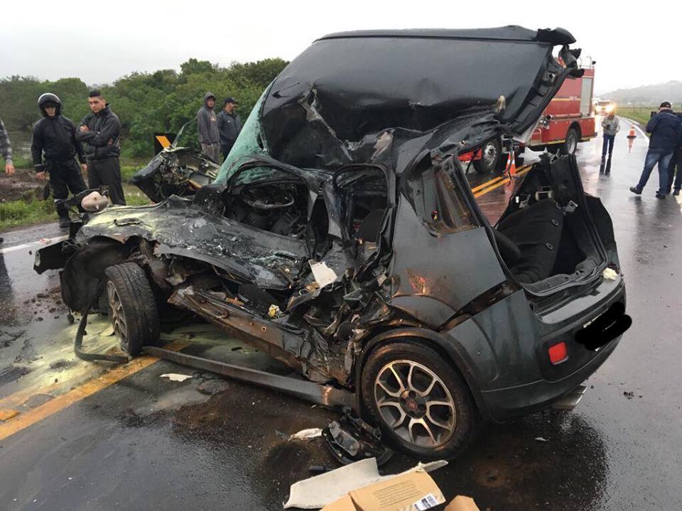 O motorista de um Fiat/Uno ficou preso às ferragens, após seu veículo colidir com caminhão, no Km 03 da RS-474, em Santo Antônio da Patrulha. O acidente ocorreu por volta das 7h, deste sábado (16).
