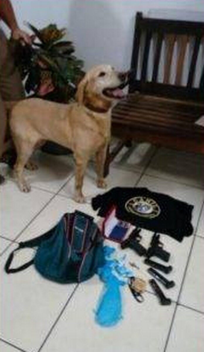 Em virtude do fato, foi solicitado apoio do Canil do 8º Batalhão de Policia Militar para verificar a presença de entorpecentes no veículo, no entanto o cão utilizado encontrou no meio do mato, uma mochila contendo três pistolas Taurus calíbre .380 modelo 58P, todas com carregadores municiados, totalizando 49 munições .380, uma balança de precisão, 107g de substância de semelhante a crack e 25g de substância semelhante a cocaína.