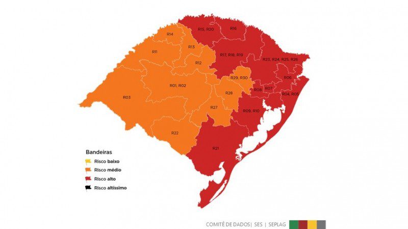A única região que apresentou redução de risco foi Santo Ângelo, passando de vermelho para laranja. As demais regiões não tiveram alteração na sua bandeira final e permanecem com bandeira laranja.