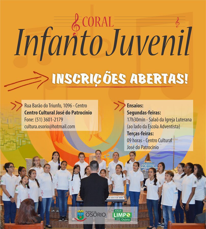 Então, aproveite a oportunidade oferecida gratuitamente pela PMO/Jogue Limpo através da Assessoria de Cultura e Juventude e faça parte do Coral Infanto Juvenil