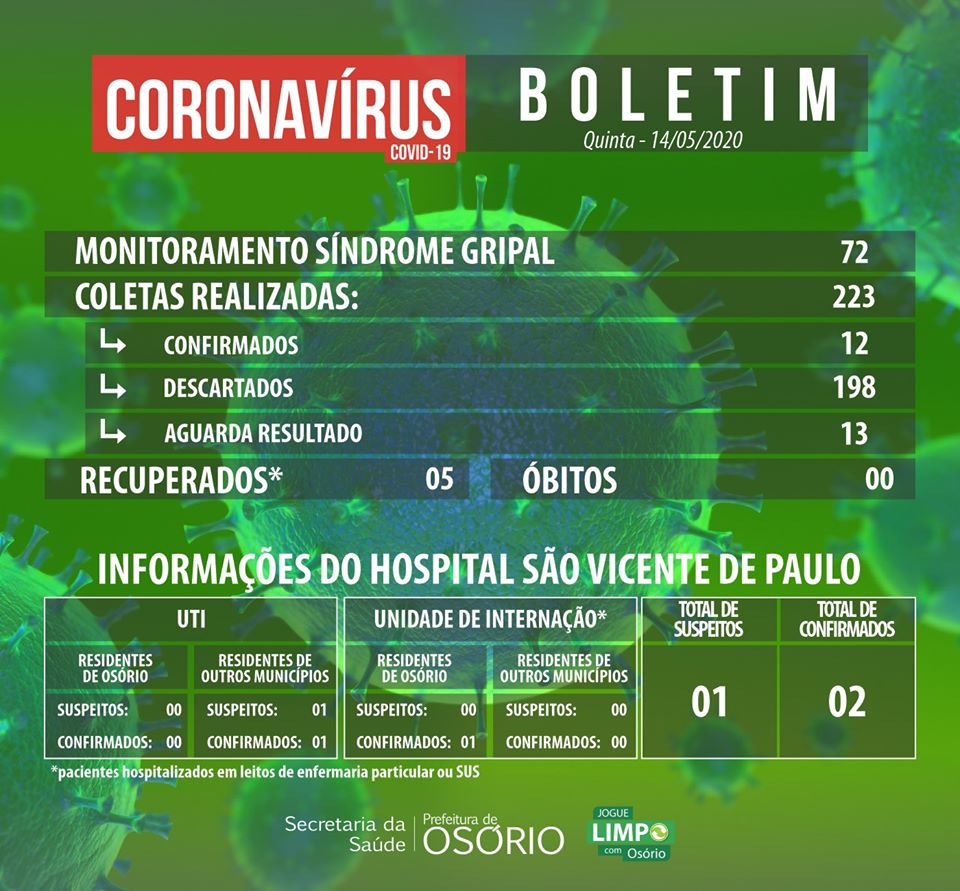 Confira os números referentes a pandemia da Coronavírus COVID 19, em Osório, nesta quinta, 14/05/2020: