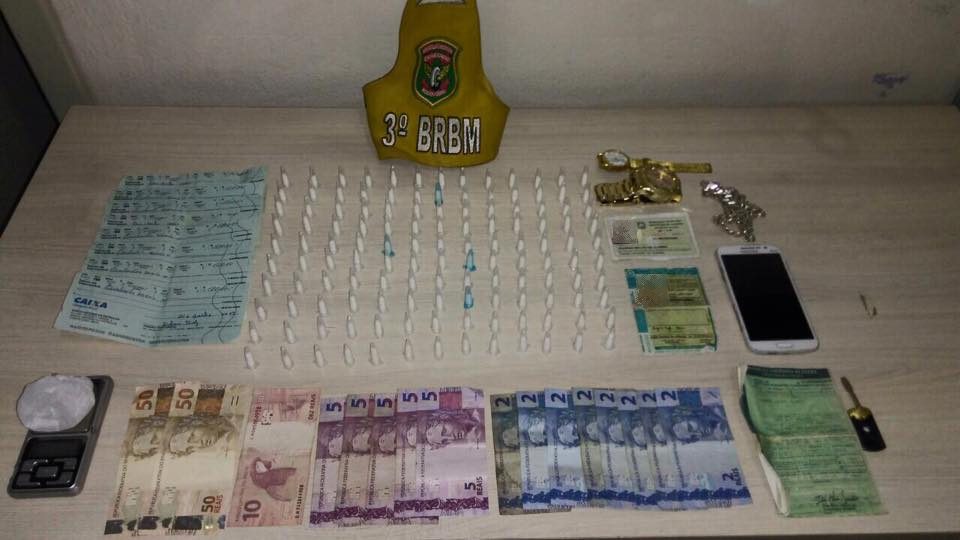 No total foram apreendidos pela polícia 140 “pinos” de cocaína, mais de cento e quarenta reais em dinheiro, cheques preenchidos que totalizavam 4 mil reais e uma balança de precisão.