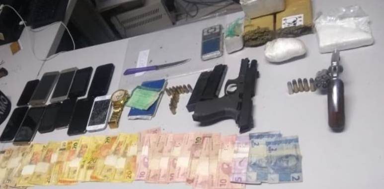 Na ação foram apreendidas: armas, balança digital, 570 gramas de maconha, 364 gramas de crack, 251 gramas de cocaína, 11 aparelhos celulares, três TVs, automóvel e moto.