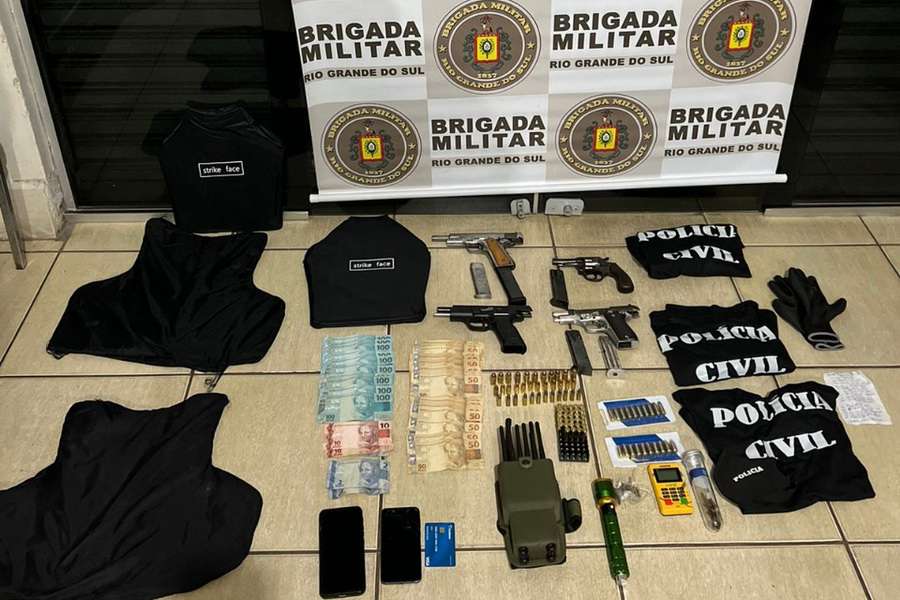 Dentro da residência foram localizados dois homens e uma mulher, além de três pistolas, um revólver, cinco carregadores, 89 estojos de calibres diversos, 96 munições de calibres diversos, dois coletes balísticos, camisetas e máscaras com a escrita “POLÍCIA” e “POLÍCIA CIVIL”, R$ 3.196, dois celulares, um bloqueador de GPS, três porções de maconha e uma máquina de cartão.
