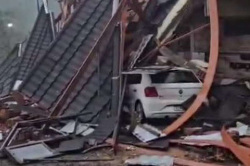 As imagens revelam o telhado desmoronado e o madeirame que sustentava a estrutura colapsado.