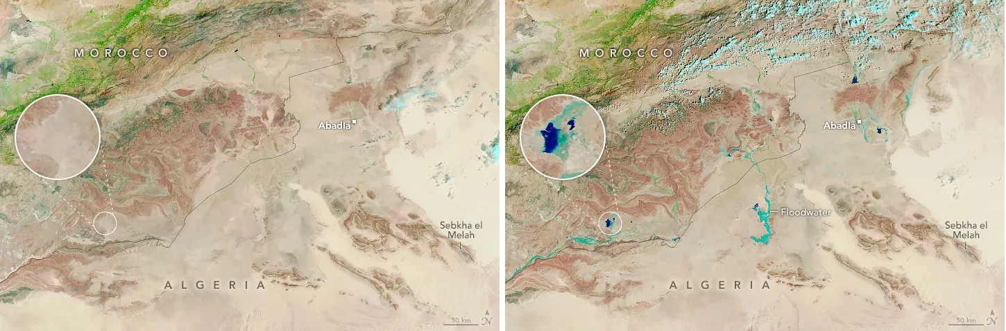O fenômeno foi provocado por um ciclone extratropical que cruzou o Noroeste do Saara em 7 e 8 de setembro, resultando em inundações em grandes áreas sem árvores do Marrocos, Argélia, Tunísia e Líbia.