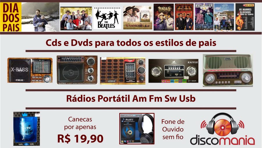 São Cds e Dvds para todos os estilos de pais. Diversos estilos de rádios portátil AM/FM/USB, canecas e muito mais.
