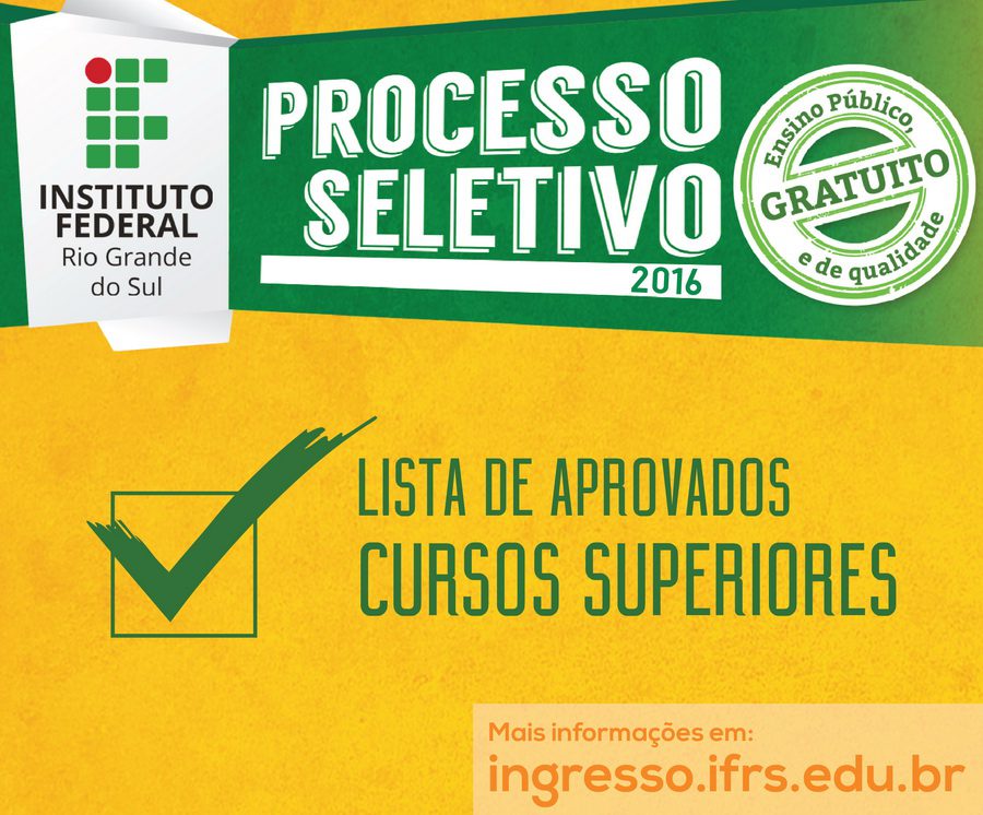 Foram divulgados os resultados da primeira chamada do processo seletivo de estudantes para cursos superiores do Instituto Federal de Educação, Ciência e Tecnologia do Rio Grande do Sul (IFRS). As listas e os calendários de matriculas de cada campus podem ser conferidos no Portal de Ingresso (ingresso.ifrs.edu.br).