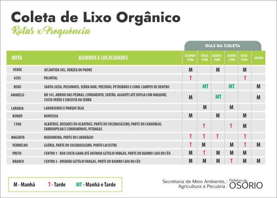Com a chegada dessa nova empresa foram implantadas algumas alterações nos dias das coletas do lixo orgânico, conforme tabela.