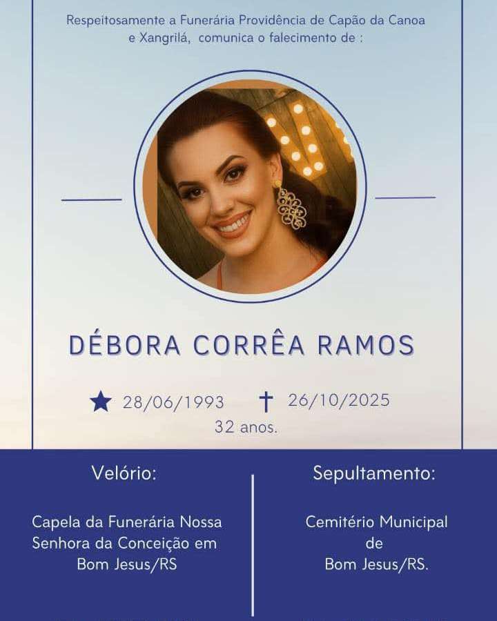 Os atos fúnebres de Débora Corrêa Ramos, de 32 anos, vítima de feminicídio em Xangri-Lá, serão realizados nesta segunda-feira (27), em Bom Jesus, nos Campos de Cima da Serra, no Rio Grande do Sul.