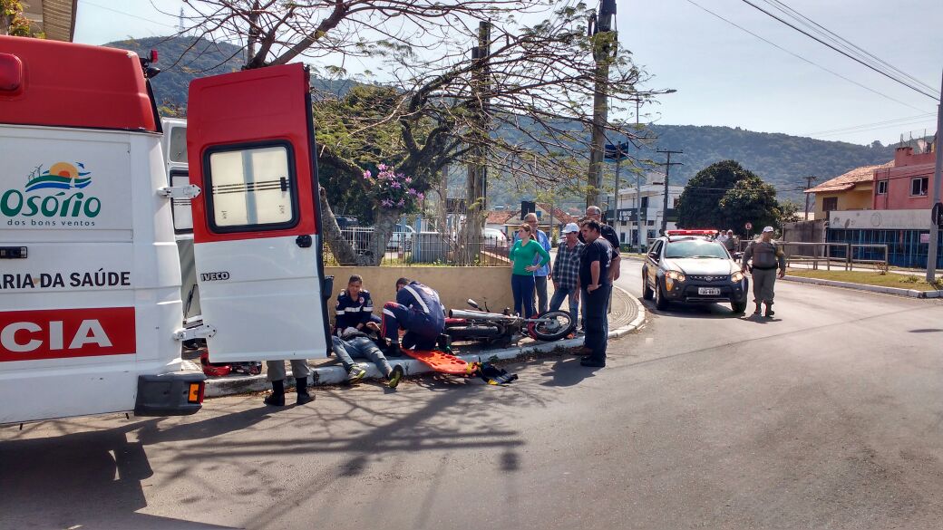 Duas pessoas ficaram feridas em um acidente de trânsito envolvendo uma moto e um carro, pouco depois do meio dia desta quinta-feira (24), na esquina das Avenidas Getúlio Vargas e Ângelo Guasselli, em Osório.