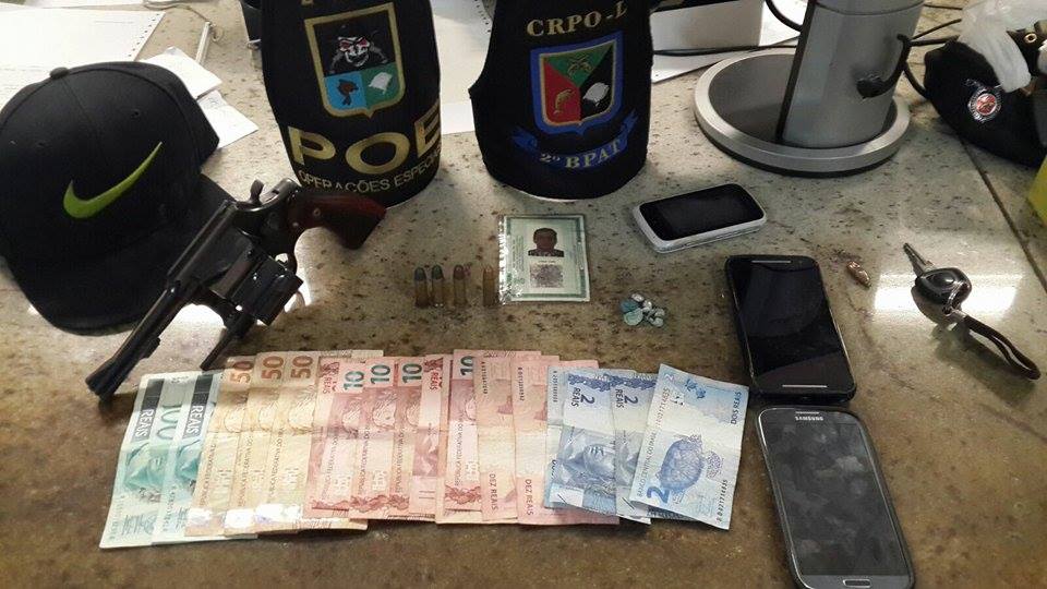 Em buscas na casa, um homem tentou fugir pulando o muro dos fundos, sendo abordado e identificado que estava foragido. Também foi localizado um revólver Marca Taurus, Cal.38, de numeração raspada, escondido embaixo da cama.