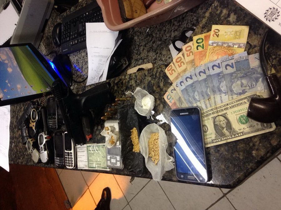 Na casa um outro homem foi detido, sendo apreendidos uma pistola 9mm (israelense), 16,8 gramas de Crack, três gramas de Cocaína, R$ 220,00, uma balança de precisão, um relógio, três rádios transmissores, um simulacro de pistola, um cachimbo, cinco celulares, um smartphone, cinco munições de 9mm intactas e um carregador de pistola 9mm.