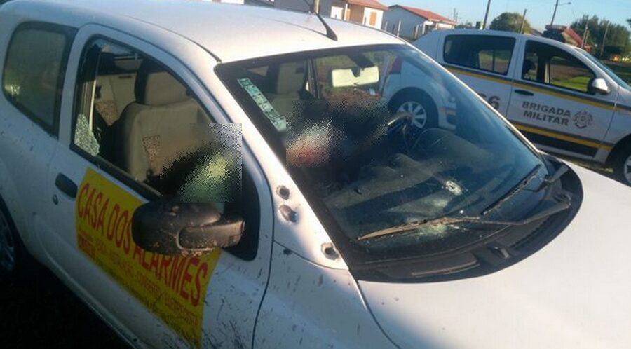 O veículo Uno, de cor branca, adesivado com o nome da empresa de alarmes da vítima, estava com diversas perfurações devido a disparos de arma de fogo.