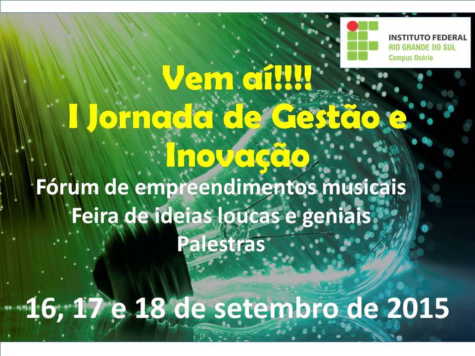 Com o objetivo de enriquecer os conteúdos transmitidos em sala de aula e apresentar novidades e tendências de mercado para o empresariado, escolas e comunidade local é que o IFRS – Campus Osório irá promover, de 16 a 18 de setembro de 2015, a 1ª Jornada de Gestão e Inovação. O evento, que contará com diversas atividades nos turnos da tarde e noite, será realizado em parceira com o Diretório Acadêmico e o Grêmio Estudantil dos cursos técnicos, por acreditar na importância do envolvimento dos alunos nas atividades para o desenvolvimento técnico-pessoal de cada um.