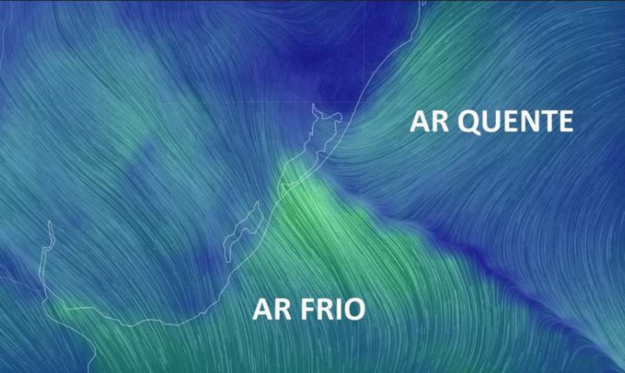 Junto ao litoral gaúcho se observa uma faixa de vento divergente separando correntes de vento de Nordeste com ar quente e outras de Sudeste com ar frio.