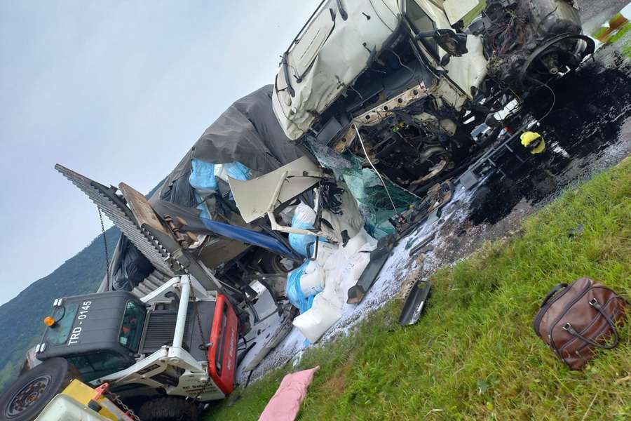 Um grave acidente de trânsito envolveu dois caminhões e provocou bloqueio parcial da BR-101, na manhã desta quinta-feira (07).