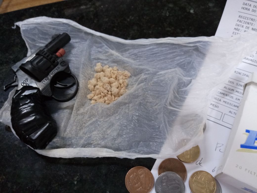 Com ele foi encontrado 4,8 gramas de crack (aproximadamente 50 pedras prontas para venda). Ele ainda tentou jogar fora, uma réplica de revólver, mas acabou sendo flagrado pelos Pms.