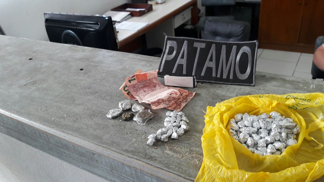 Após receber denúncias sobre um ponto de venda de drogas na região, os policiais foram até o local verificar. Ao chegar encontraram o rapaz e com ele apreenderam 114 pedras de crack, cinco tijolinhos de maconha e R$20.