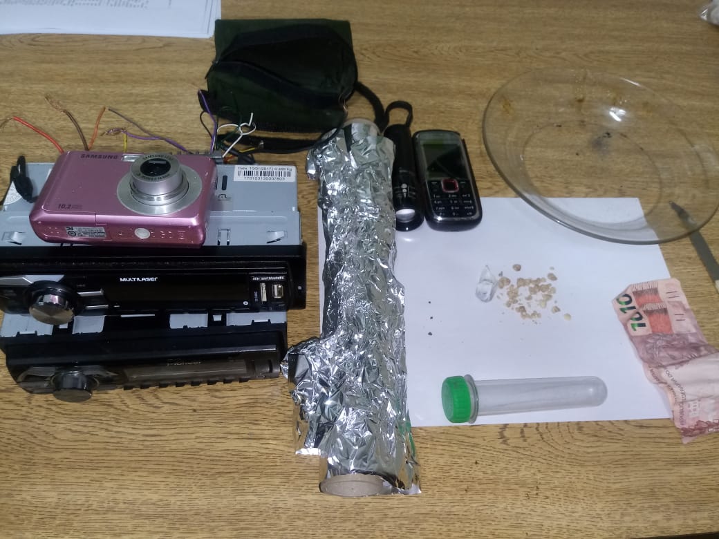 Com ele foi apreendido um tubo plástico contendo diversas pedras de crack, fracionadas para a venda, rolo de papel laminado, prato para fracionar o entorpecente, faca, celular, máquina fotográfica, dois rádios automotivos e R$ 20,00.