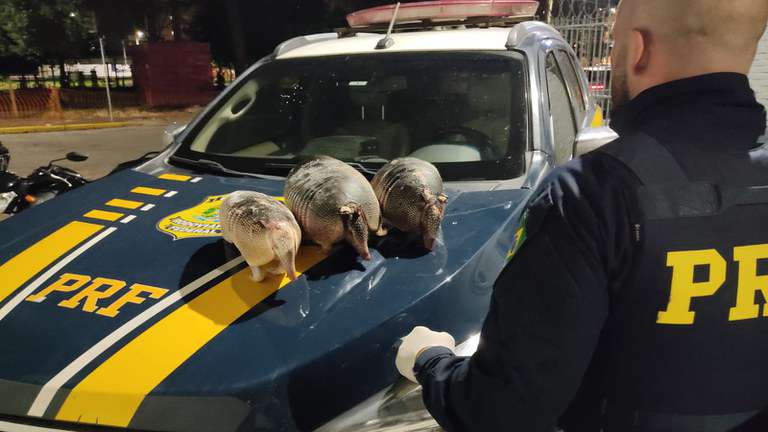 No início da noite desse domingo (25), a Polícia Rodoviária Federal prendeu um homem com três tatus abatidos.