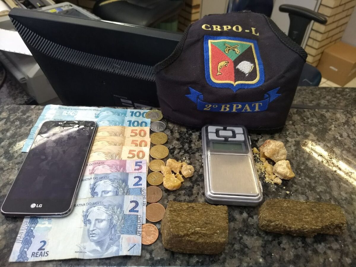 Com ele foi encontrada uma balança de precisão, R$ 361,35, 28,9 gramas de crack e 82,8 gramas de maconha.