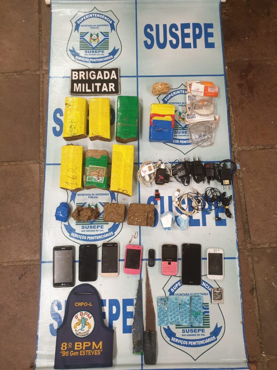 Após realizarem revista nas celas do módulo V1 bem como na área externa da galeria B, apreenderam os seguintes materiais: 4 kg de maconha, 100 gramas de crack, 100 gramas de cocaína, oito celulares, seis carregadores de celular, três fones de ouvido, oito resistências para fogão artesanal, uma faca artesanal e cinco cartelas de Viagra.