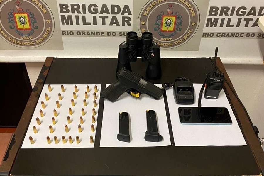 Na abordagem e identificação do indivíduo de 24 anos, os policiais encontraram em sua cintura uma pistola de calibre 9mm municiada, 37 munições para essa arma, dois carregadores de pistola, um binóculo e um radiocomunicador.