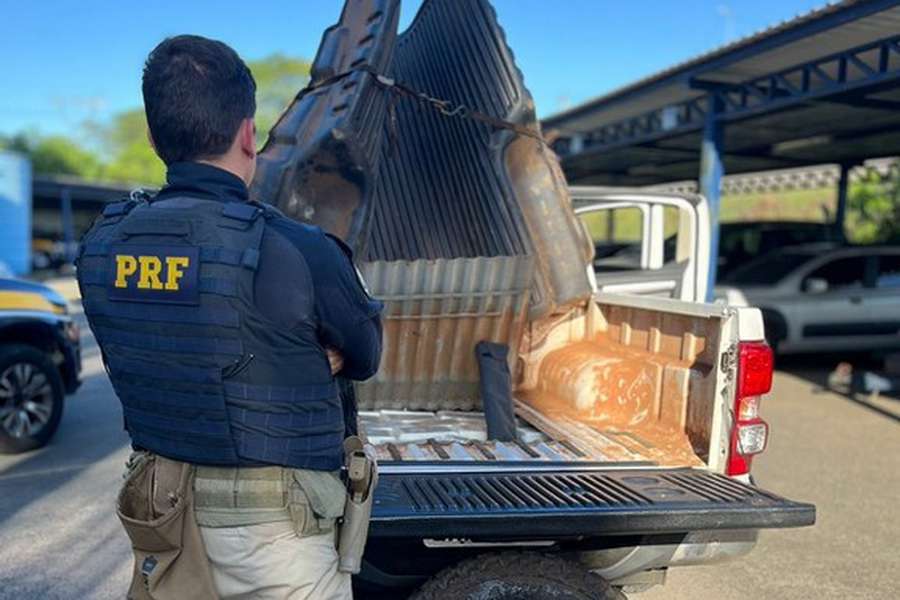 O condutor informou estar envolvido em serviços de terraplanagem, mas uma minuciosa verificação revelou um acesso suspeito na carroceria e no estepe do veículo.