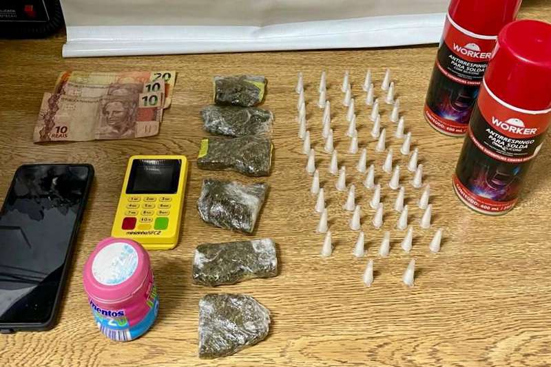 Os policiais revistaram o automóvel e descobriram 42 pinos de cocaína adicionais, além de seis porções de maconha totalizando 110 gramas.