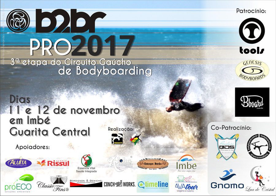 Imbé receberá neste final de semana (11 ou 12 de novembro) a 3ª etapa do Circuito Gaúcho de Bodyboarding 2017. O B2BR Pro será junto a Guarita Central, no calçadão, e poderá definir alguns campeões estaduais de forma antecipada, já que a etapa final acontecerá em dezembro. Conforme a Federação Gaúcha de Bodyboarding (FGB), o evento será realizado no dia que tiver as melhores condições de ondulação e vento, conforme as previsões. A Prefeitura apoia a competição.