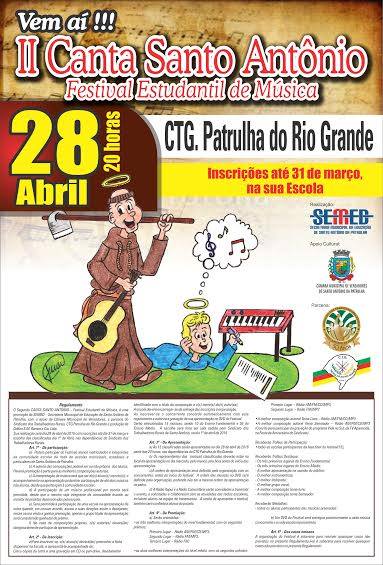 A Prefeitura Municipal de Santo Antônio da Patrulha, através da Secretaria da Educação, promoverá o II Canta Santo Antônio – Festival Estudantil de Música no dia 28 de abril, a partir das 20 horas, na sede do CTG Patrulha do Rio Grande, parceiro do evento juntamente com o Sindicato dos Trabalhadores Rurais, com apoio da Câmara Municipal de Vereadores.