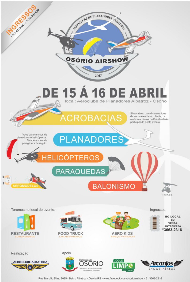 Dias 15 e 16 de abril acontecerá o “Osório Airshow”. A programação terá shows aéreos com acrobacias, voos panorâmicos de planadores e helicópteros, espaço kids, espaço para shows de bandas, praça de alimentação, estandes e muito mais, como a presença dos melhores pilotos do Brasil, que farão um “show no ar”.