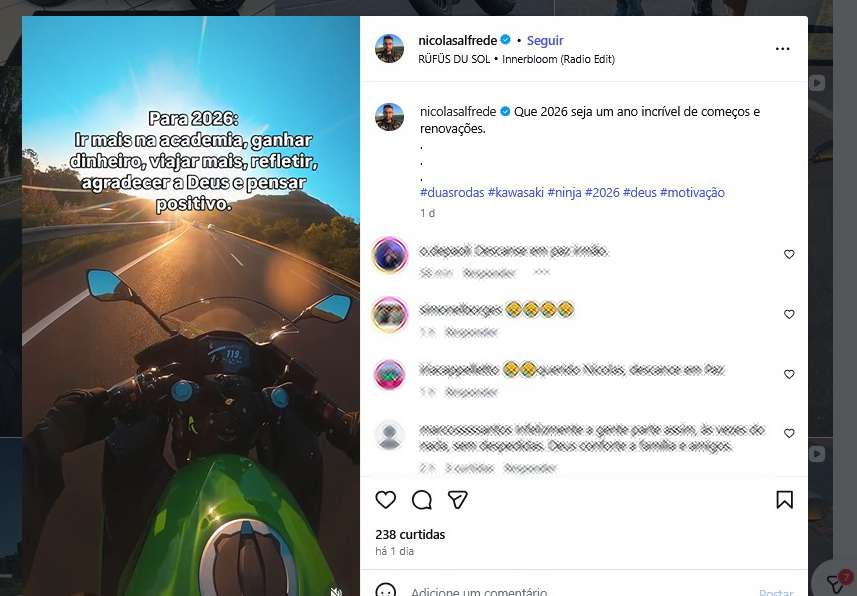 Em uma de suas últimas postagens, Nicolas compartilhou um vídeo pilotando sua motocicleta, acompanhado de uma mensagem reflexiva e otimista: