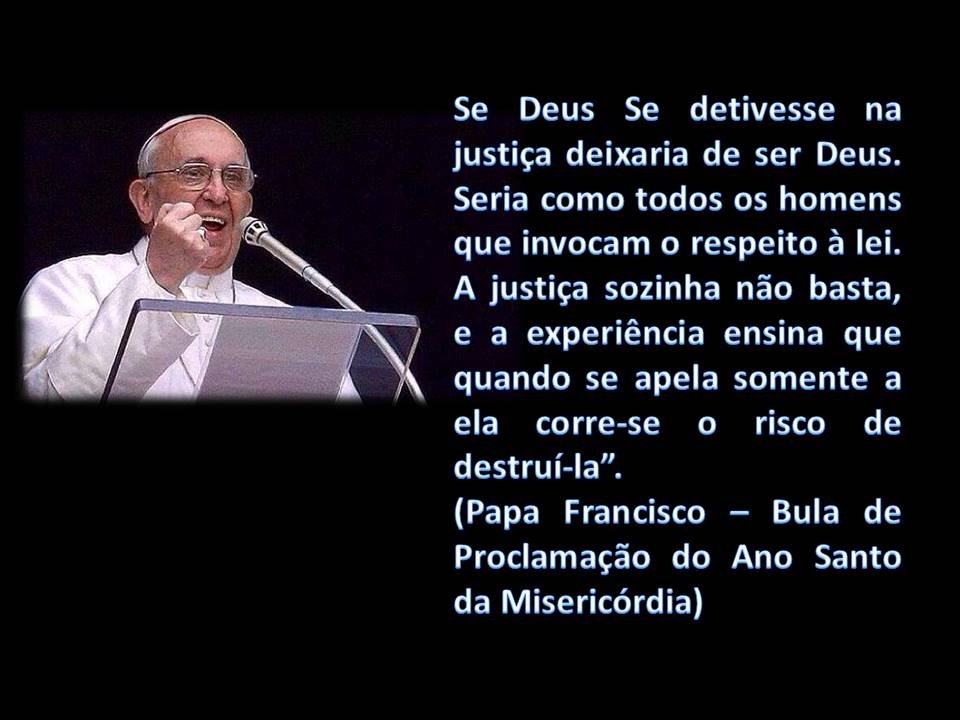 “Se Deus se detivesse na justiça deixaria de ser Deus; seria como todos os homens que invocam o respeito à lei. A justiça sozinha não basta e a experiência ensina que quando se apela somente à ela corre-se o risco de destruí-la”. (Papa Francisco – Bula de Proclamação do Ano Santo da Misericórdia).