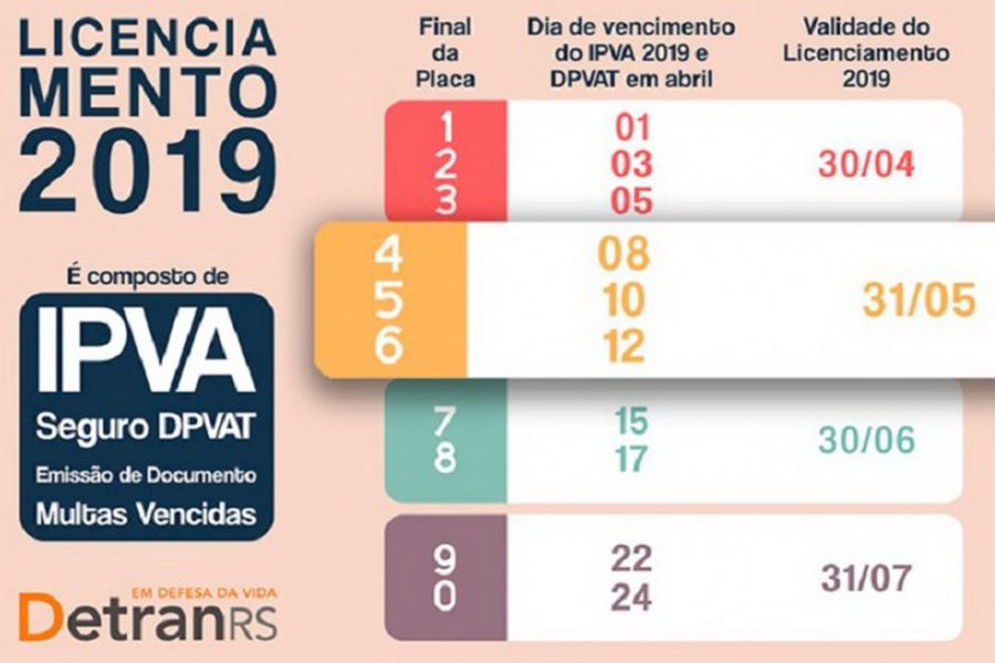 O DetranRS alerta, ainda, que dirigir veículo com licenciamento vencido é infração gravíssima, passível de multa de R$ 293,47, sete pontos na CNH, além de remoção do veículo a depósito, até a regularização.