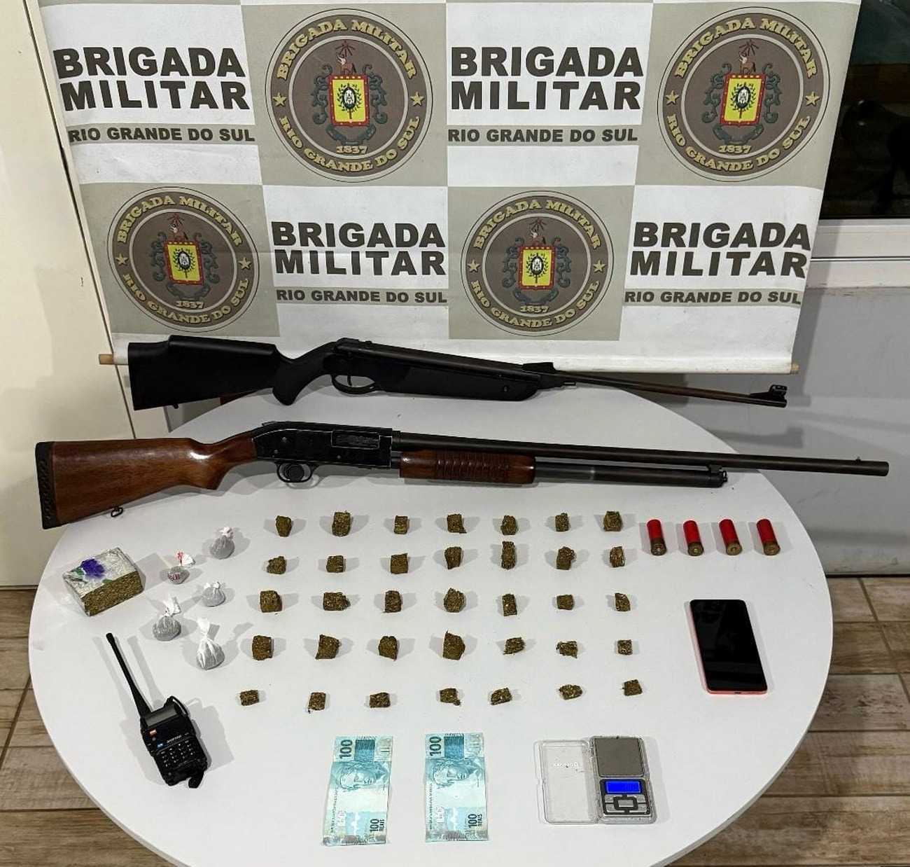 Com ele foram apreendidos 352 gramas de maconha em diferentes formatos, uma espingarda calibre 12 com numeração raspada, quatro cartuchos, uma balança de precisão, um radiocomunicador e até uma espingarda de pressão, reforçando o risco que o indivíduo representava à segurança pública.