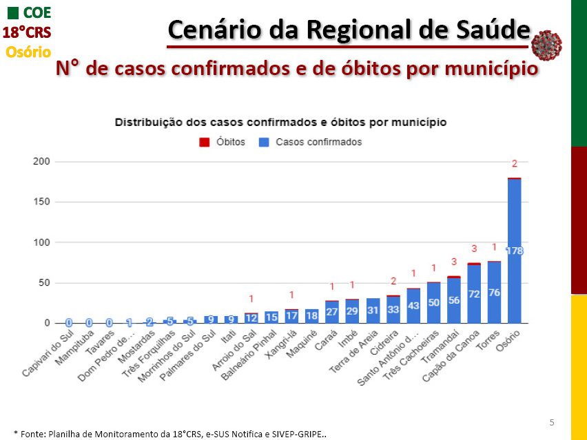 Osório tem 178 casos confirmados, Torres (76), Capão da Canoa (72), Tramandaí (56), Três Cachoeiras (50), Santo Antônio da Patrulha (43) e Cidreira (33).
