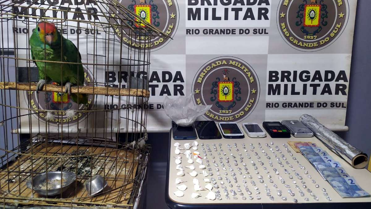 Em buscas na residência e com a mulher, foram localizadas mais 166 pedras de crack, 31 porções de cocaína, uma balança de precisão, uma máquina de cartões, quatro celulares, R$73 e um papagaio preso numa gaiola.