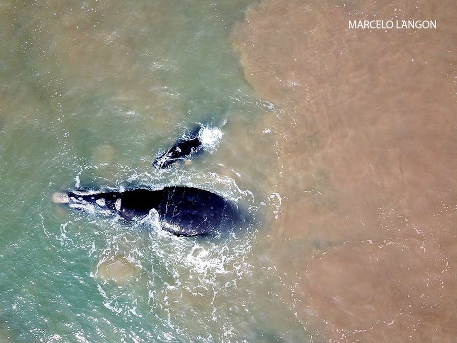 Foi nesta divisão de cores que as baleias foram vistas durante toda a tarde daquele dia. “Elas estavam nitidamente explorando as diferentes cores do mar e se divertindo muito”, comenta Langon.