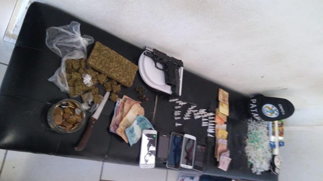 Com eles foram encontrados: um tijolo de maconha pesando 270 gramas, 132 gramas da mesma droga, já pronta para a venda, 39 pinos de cocaína, 600 microtubos pinos de Eppendorf, duas balanças de precisão, R$ 1345, além de uma pistola que havia sido roubada de uma empresa de segurança privada.